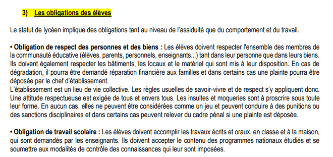 - Le règlement intérieur du lycée (lycée X) :