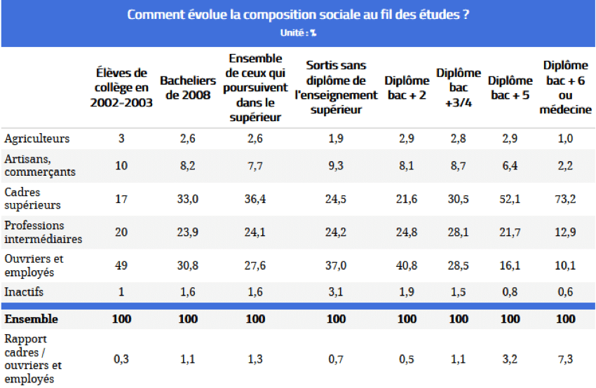 Ce tableau illustre les propos venant d’être tenus. En effet, à titre d’exemple, les étudiants ayant un bac + 6 ou ayant choisi médecine sont seulement 2,2% à avoir des parents artisans / commerçants. A contrario, la grande majorité des étudiants à bac + 6 ont des parents cadres supérieurs (73,2%).