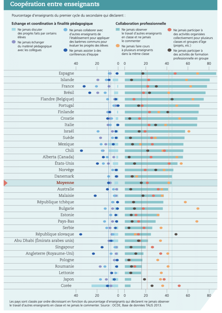 À travers ce document, il est mis en évidence que les enseignants en France ont peu la culture du travail d’équipe. En effet, chaque enseignement est divisé et lorsque le professeur pénètre dans sa classe, il se retrouve seul face aux élèves. Il est rare que quelqu’un vienne observer le cours d’un collègue sauf à l’occasion des inspections où l’enseignant est observé. Les chiffres sont sans appel. Environ 79% des enseignants du premier cycle du secondaire déclarent « ne jamais observer le travail d’autres enseignants en classe et ne jamais le commenter ». Sur un classement de 32 pays, la France se classe à la 29e place des pays où les enseignants sont peu coopératifs. Il n’y a que l’Islande et l’Espagne qui font pire que la France avec des taux qui sont respectivement de 81% et de 87%. On retrouve en tête de ce classement, des pays comme la Corée, le Japon ou encore l’Angleterre.