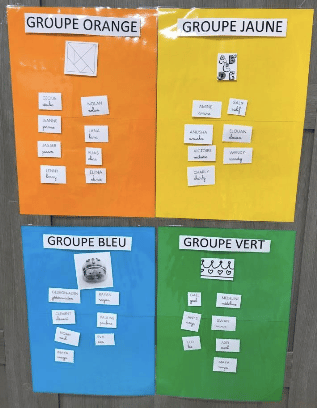 Elle a donc opté pour un rappel du thème de l’activité de chaque groupe, sur le tableau du coin regroupement et sur l’affichage des groupes comme la photo ci-dessous :