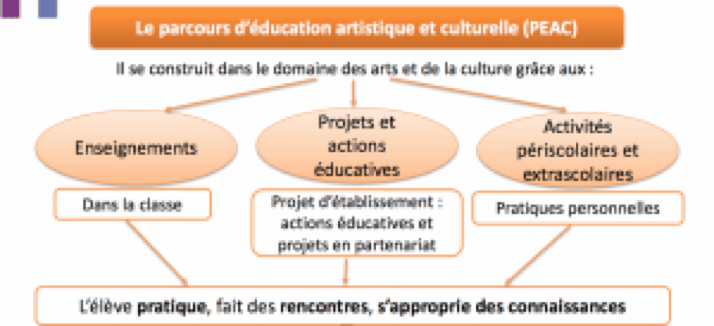 Le Parcours d’Education Artistique et Culturelle est l’ensemble des connaissances acquises par l’élève, des pratiques expérimentées et des rencontres faites dans les domaines des arts et du patrimoine, que ce soit dans le cadre des enseignements, de projets spécifiques, d’actions éducatives, dans une complémentarité entre les temps scolaires, périscolaires et extrascolaires.