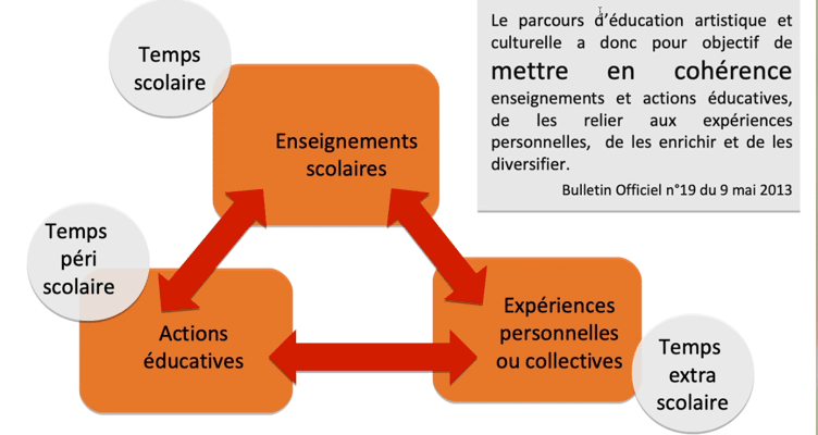 Le parcours est construit conjointement par l’ensemble des acteurs impliqués dans l’éducation artistique et culturelle et par l’élève lui-même.1 http://cache.media.education.gouv.fr/file/12_Decembre/43/1/Guide-parcours-EAC_288431.pdf